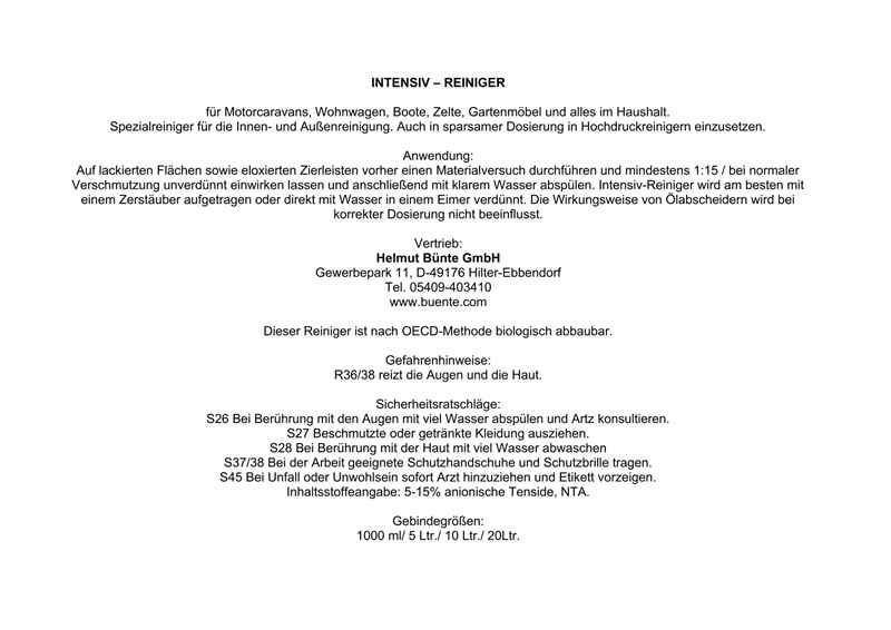 BÜNTE Intensiv-Reiniger ist ein hochwirksamer Reiniger, der speziell für die Reinigung von Wohnwagen, Booten, Zelten, Planen und anderen Oberflächen entwickelt wurde. Der Reiniger wird in einem praktischen 20 l Kanister geliefert.