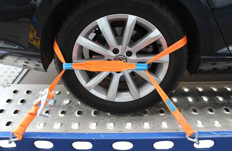 Der Radzurrgurt ist 3-teilig und verfügt über Schlaufen, die eine einfache Befestigung ermöglichen. Die Spitzhaken sind einfach zu bedienen und sorgen für eine sichere Verbindung. Der Gurt ist robust und langlebig, um den Anforderungen des Transports standzuhalten.