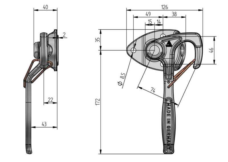FBS Winkelhebelverschluss, links, Größe 1m. Federsicherung, Hebellänge 172 mm, Stahl verz.