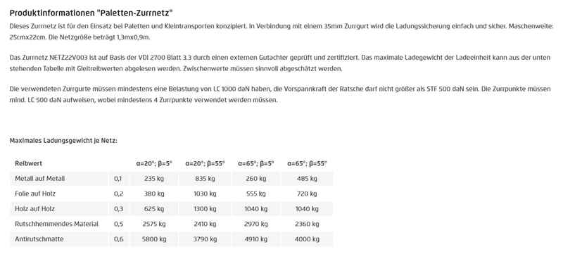 Das Gurtbandnetz mit den Maßen 35 x 900 x 1300 mm und einer Tragkraft von 1000 daN ist ideal für den Einsatz auf Paletten geeignet.