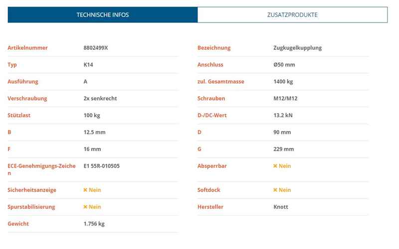 KNOTT K14-A is a high-quality trailer coupling with a maximum load capacity of 1400 kg. It has a diameter of 50 mm, making it suitable for various towing applications.