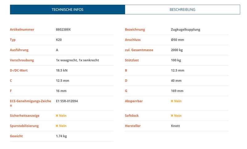 KNOTT K20-A is a high-quality trailer coupling with a maximum load capacity of 2000 kg. It has a diameter of 50 mm, making it suitable for various towing applications.