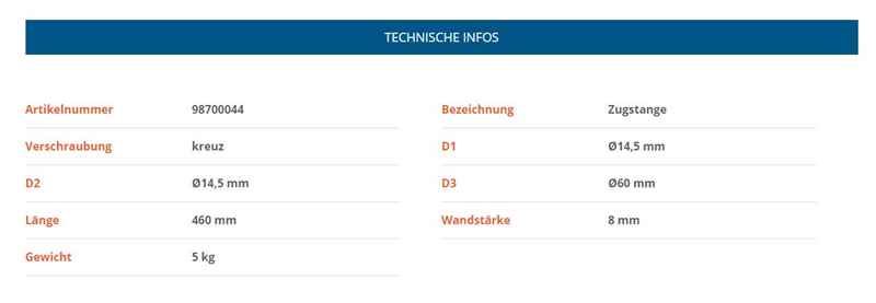 Die KNOTT Zugstange ist speziell für IFOR WILLIAMS Anhänger geeignet und hat einen Durchmesser von 60 mm und eine Länge von 460 mm.