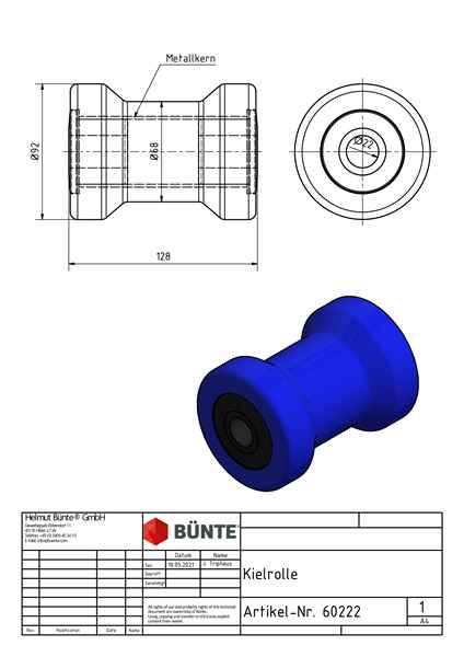 Produktinformationen "Kielrolle, Ø 90 x 130 mm, Bohrung Ø 22 mm, blau"