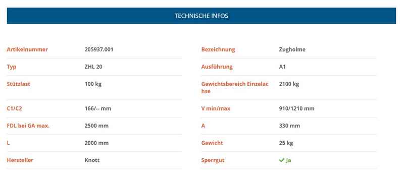 KNOTT Zugholme ZHL20, Ausf. A1, 2100 kg, 2000 mm