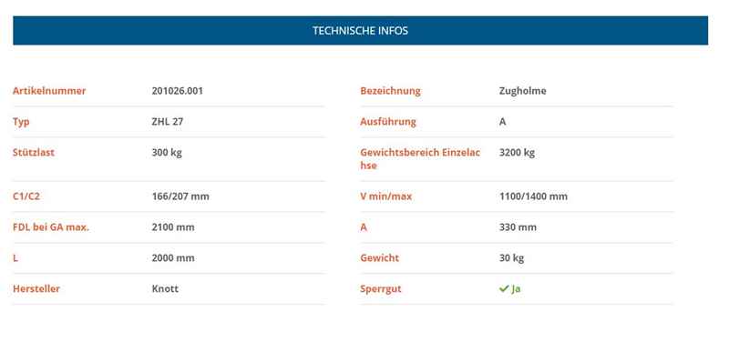 KNOTT Zugholme ZHL27, Ausf. A, 3200 kg, 2000 mm