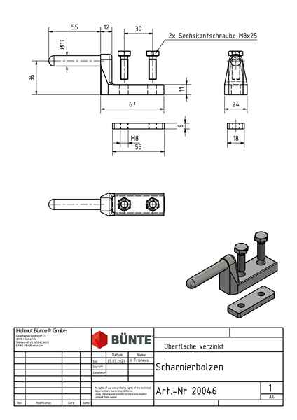 Der Scharnierbolzen wird zusammen mit einer Anschraubplatte und 2 Sechskantschrauben M8 geliefert. Dadurch ist eine einfache und sichere Montage gewährleistet.
