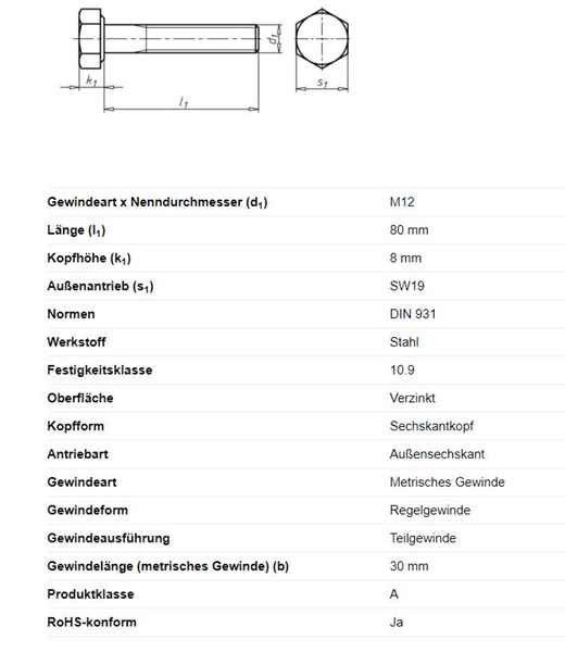 Die Sechskantschraube mit Schaft in der Größe M12 x 80 mm ist ein hochwertiges Befestigungselement, das in verschiedenen Anwendungen eingesetzt werden kann. Mit einer Schlüsselweite von 19 und der DIN 931 Norm erfüllt sie alle gängigen Standards und bietet eine hohe Festigkeit mit der Festigkeitsklasse 10.9.