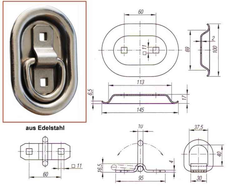 Die Zurrmulde ist oval geformt und hat die Maße 100 x 145 x 20 mm. Sie verfügt über eine Lasche/Ring und ist aus Edelstahl rostfrei gefertigt. Die maximale Belastbarkeit beträgt 800 daN.